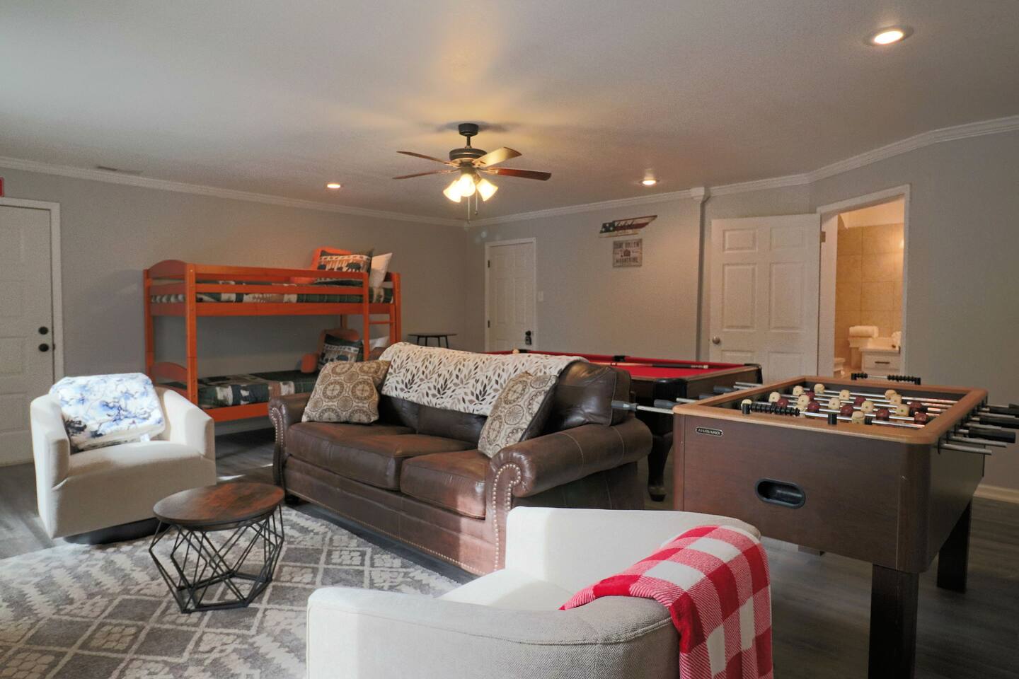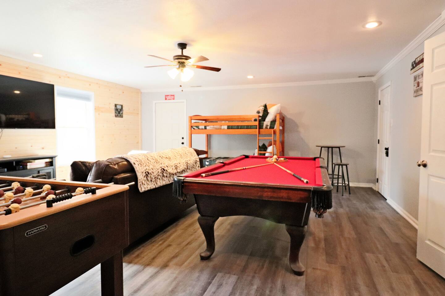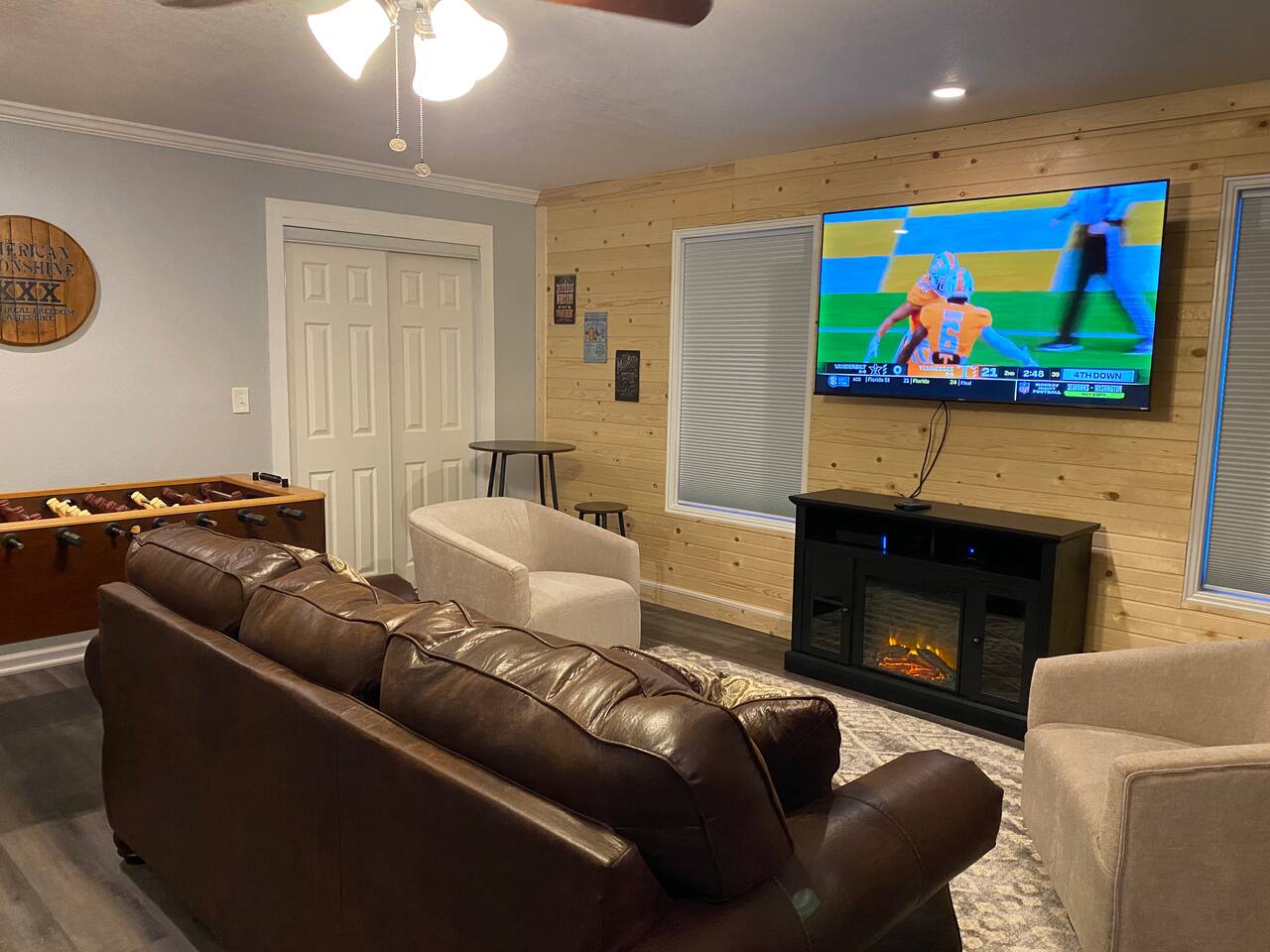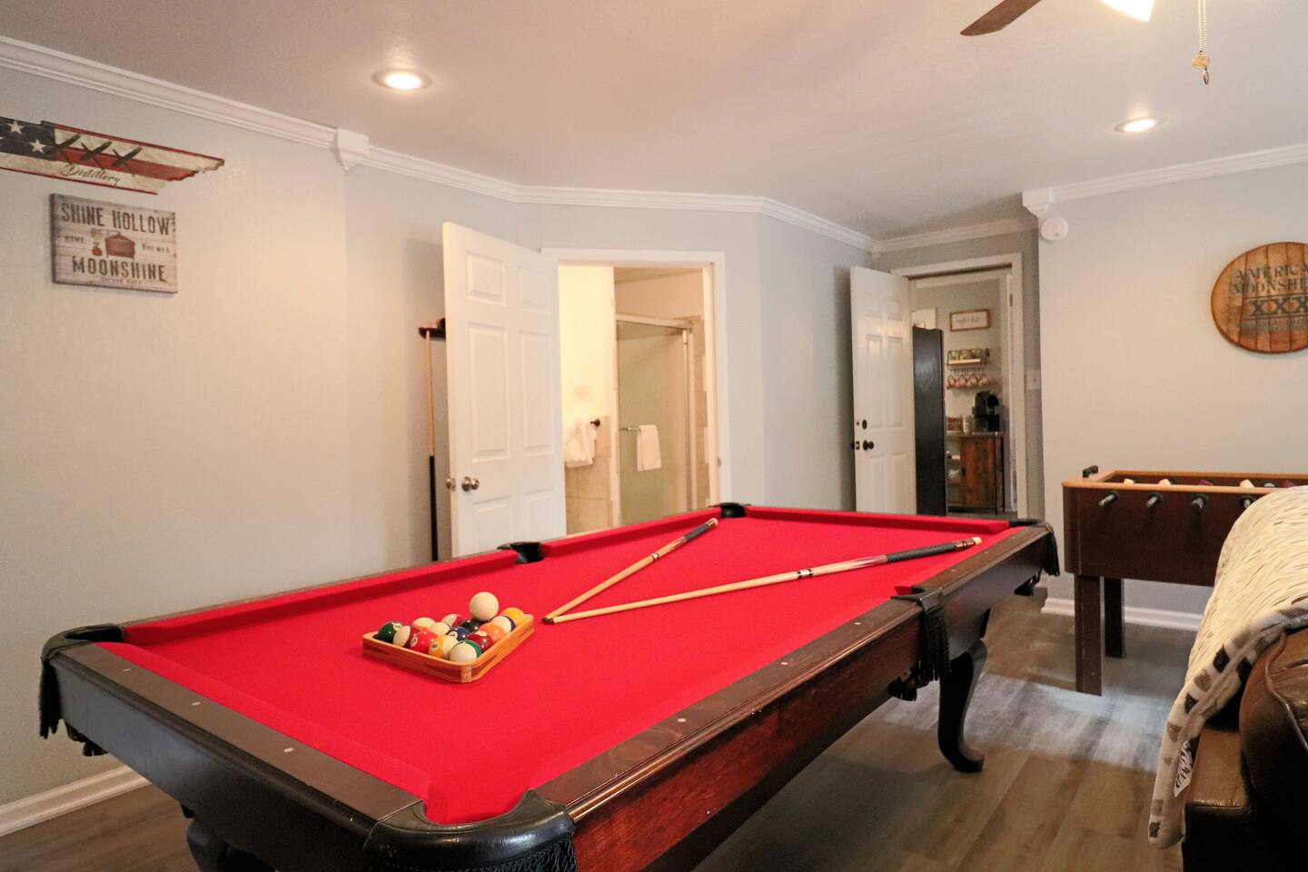 We are proud to offer a 1 gigabit high-speed WiFi Internet connection to keep you and your guests connected and entertained. Relax in the media room with a big screen TV for movies and sports, a pool table and foosball that will have everyone competing for bragging rights. Soak in the relaxing 2-person jacuzzi. Enjoy late night laughs with TVs in each bedroom. Brings the entire family together for stories and board games with a gas fireplace in the living room. Decompress after a fun day in Gatlinburg or the Smokeys with the outdoor hot tub and fire pit. After every guest stay, Shiner’s Hollow is professionally cleaned for a more enjoyable experience.